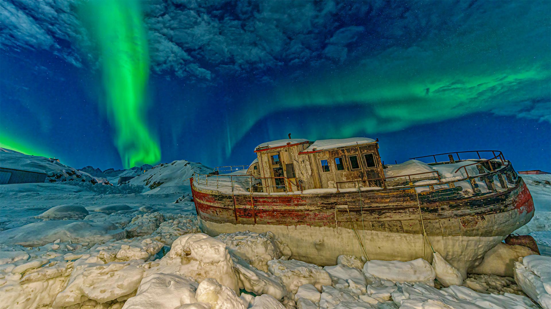 Northern lights over a stranded boat in Tasiilaq